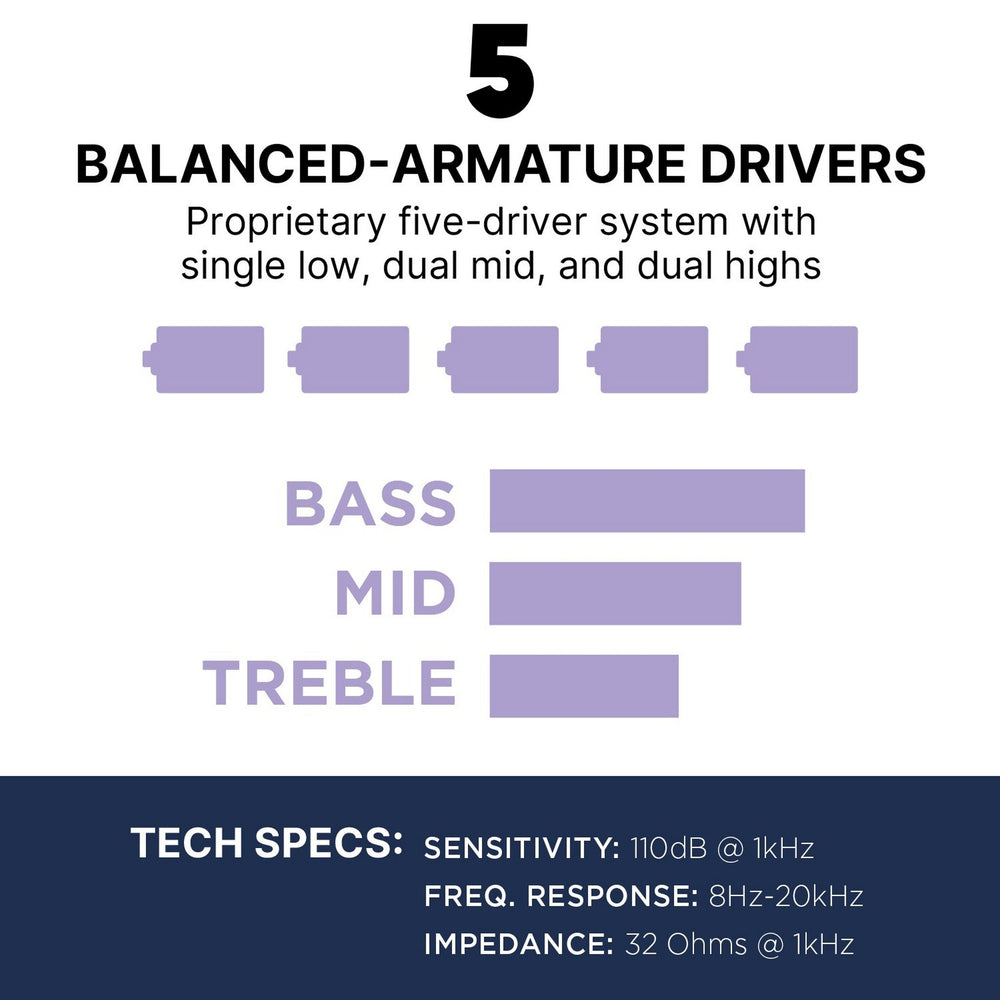 - Driver Configuration: 5 balanced-armature drivers (single low, dual mid, dual high)