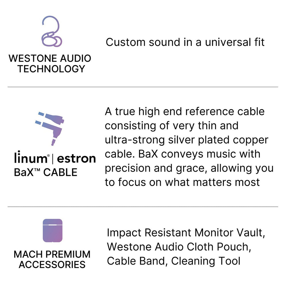 The Westone MACH 50 in-ear monitors are meticulously engineered for musicians, audio engineers, and audiophiles seeking a balanced and immersive listening experience. Featuring a five-driver balanced-armature system with a 3-way passive crossover, these monitors deliver clear highs, articulate mids, and a warm low-end response. The ergonomic design ensures comfort during extended listening sessions, making them ideal for both stage performances and studio use.