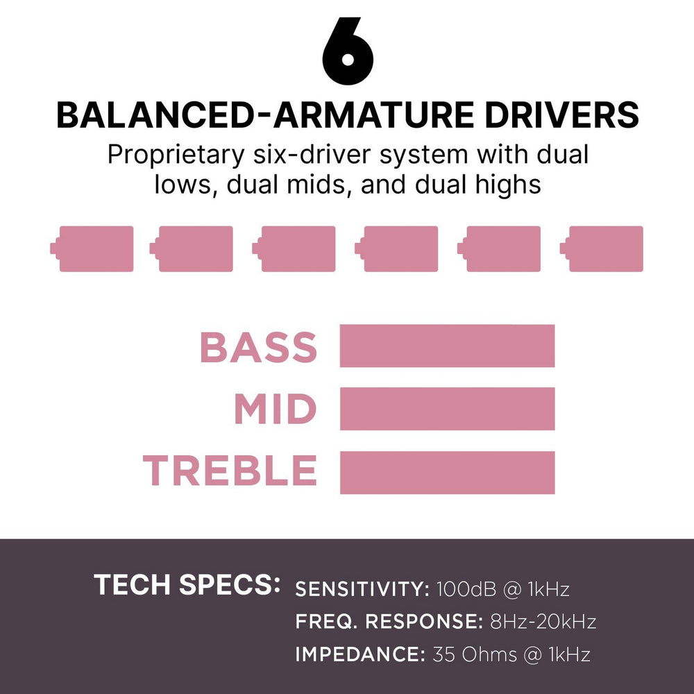 - Driver Configuration: 6 balanced-armature drivers (single low, dual mid, triple high)
