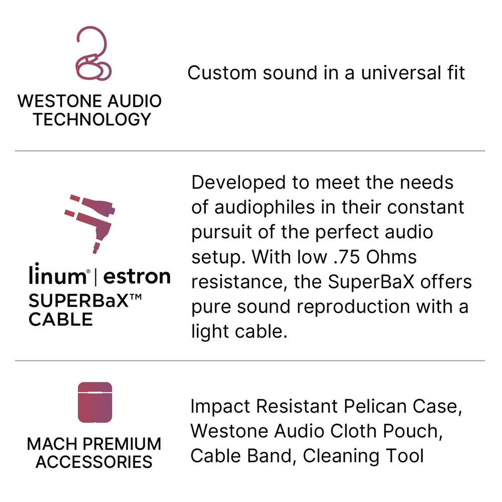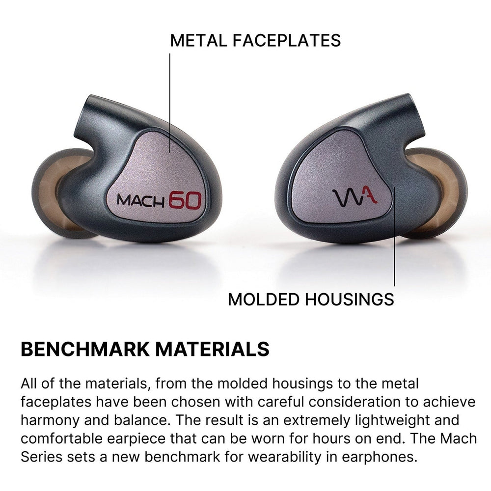 The Westone MACH 60 in-ear monitors deliver exceptional sound clarity with a sophisticated six-driver balanced-armature design and 3-way passive crossover system. Crafted for professional musicians, sound engineers, and discerning audiophiles, the MACH 60 offers a detailed audio experience with crystal-clear highs, lush mids, and deep, powerful bass.