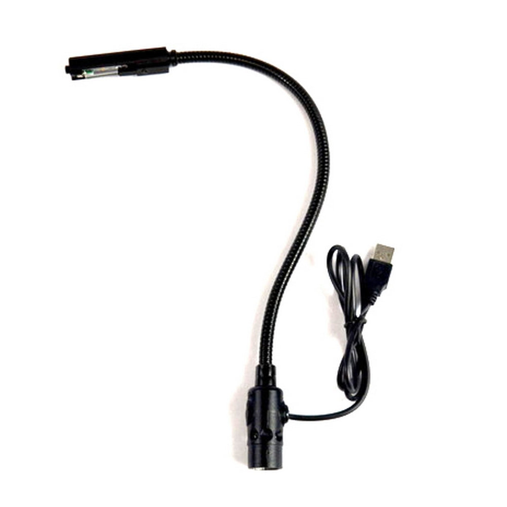 LED gooseneck light on pinless XLR connector. Includes hood mounted on/off switch. Plugs into any unused microphone input connector (XLR) and powers from standard USB connector (5 Volts).