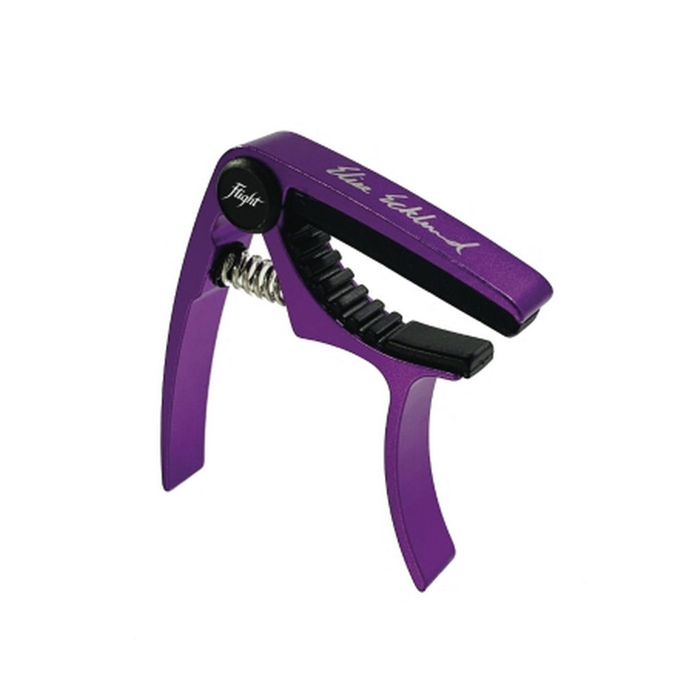 Made specifically for the ukulele, this spring-loaded capo is a perfect fit for Flight ukuleles without risk of buzz or damage to your instrument. This capo is made with a matte finish in a stunning purple which just so happens to be Elise' favorite color. This amazing little tool goes perfectly with the Elise Ecklund signature ukulele and its purple sunset and mountains, but you can use this capo with any instrument in the Flight ukulele range. Flight want to take you to dizzying heights with your playing and this is just one way to help you achieve it. Flight also want to play its part in protecting the environment which is why your capo will arrive in a nice eco-friendly protective box.
