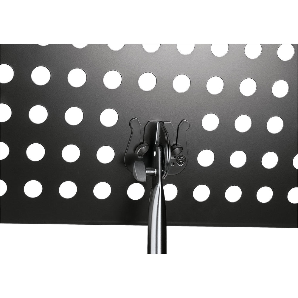 Introducing the K&M 12179 Music Stand, a reliable and versatile solution for musicians seeking a sturdy yet portable stand. This music stand features a perforated desk measuring 19.61" x 12.76" (498 x 324 mm), providing ample space for sheet music or books. Constructed from high-quality steel, the stand ensures durability and stability during performances or practice sessions. Its U-profile legs snap into the socket and are foldable, allowing for easy transport and storage. The quick-release lock facilitates swift assembly and disassembly, making it an ideal choice for musicians on the go.