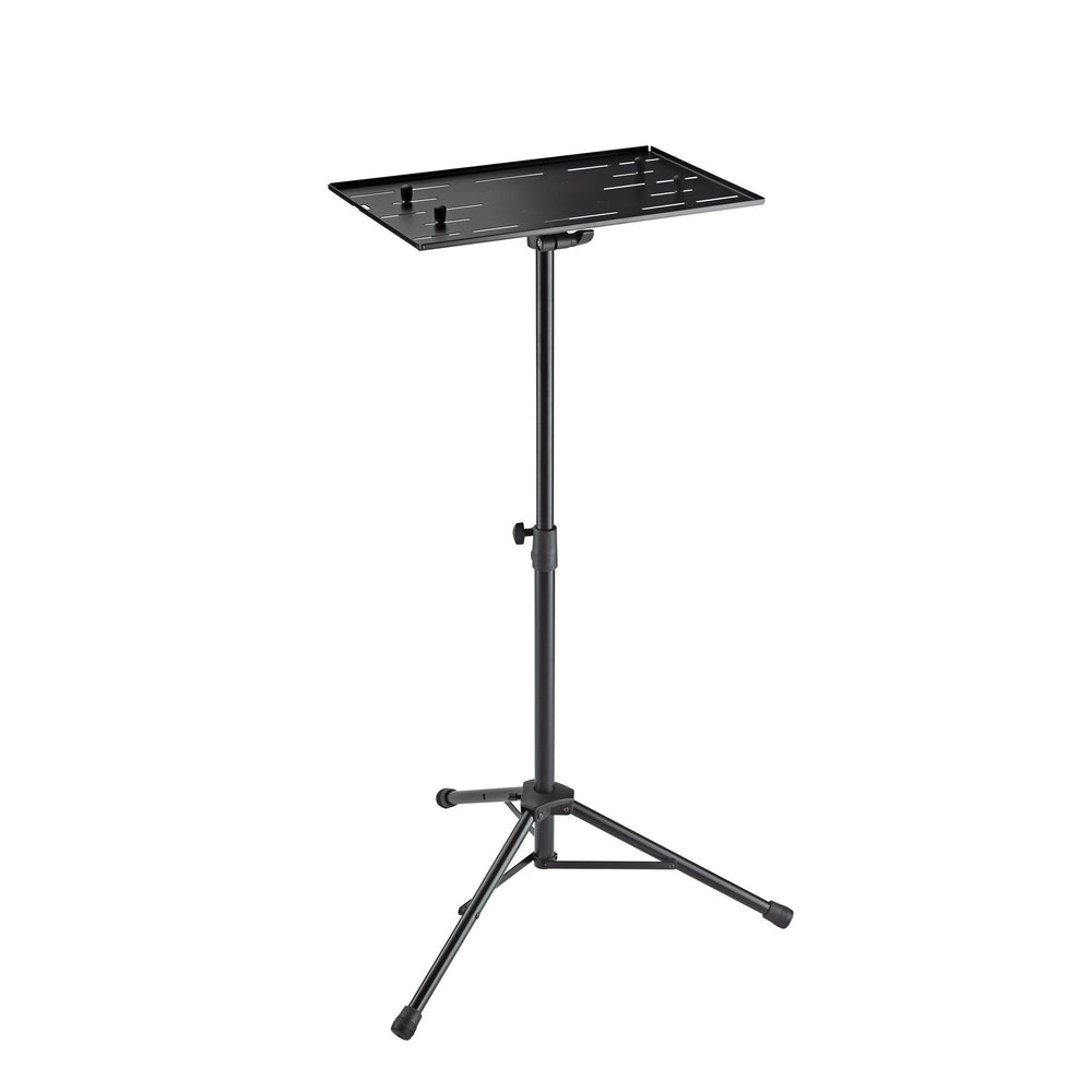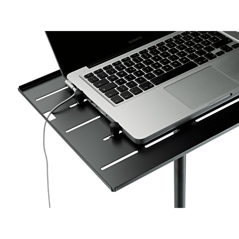 The K&M 12185 Laptop Stand is a robust and versatile solution designed to securely hold laptops during performances, rehearsals, or studio sessions. Featuring a generously sized tray measuring 18.86" x 12.28" (479 x 312 mm), it accommodates all common laptop sizes. The stand's adjustable clamping bolts with rubber caps ensure that your laptop is held firmly in place without causing damage. To secure the laptop, the clamping bolts are pressed on the laptop using wing nuts. An additional hole allows convenient cable management, keeping your workspace organized and free from clutter. The stand's height is adjustable from 27.56" to 49.21" (700 to 1,250 mm), allowing you to position your laptop at the most comfortable and ergonomic height. Constructed from durable steel, the stand offers a maximum load capacity of 22 lbs (10 kg), making it suitable for a wide range of laptops and accessories. Its foldable design allows for easy transport and storage, making it an ideal choice for musicians and DJs on the go. The sleek black finish adds a professional touch to any setup.