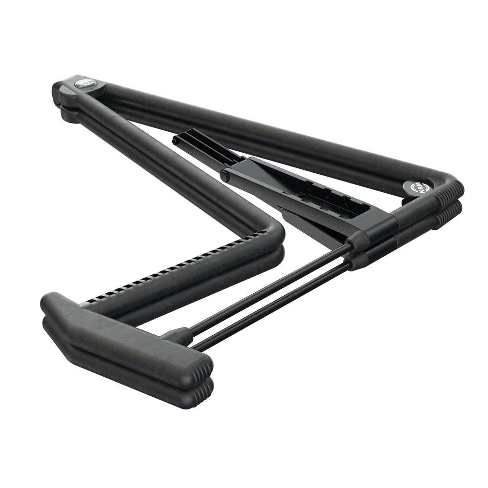 The 17580 A Guitar Stand Heli 2 Red is a world-renowned stand designed to provide exceptional care for your guitar or other instruments. Thanks to its new rubber structure, your instrument is securely supported without any risk of damage. The stand is highly versatile, featuring an innovative adjustable crossbar, allowing it to accommodate various instrument sizes, from guitars to cellos and even French horns. When not in use, it folds flat for easy storage and transport, and includes a practical transport lock for added convenience. Plus, it even comes with integrated guitar pick holders and includes two picks.