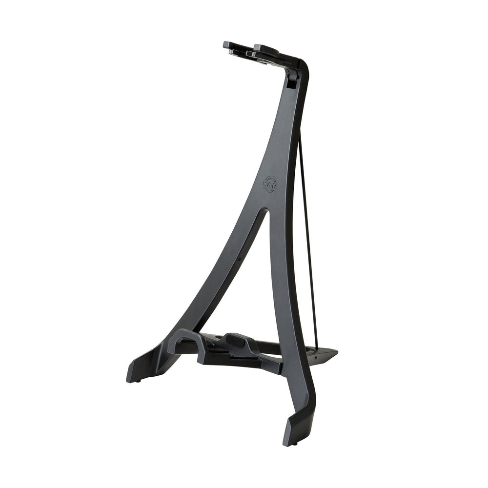 Introducing the 17650 Guitar Stand "Carlos" by König & Meyer, a unique and innovative solution for securely holding your acoustic or electric guitar. This stand features a tall A-frame design crafted from durable, lightweight plastic, ensuring both functionality and stability. Its one-piece construction allows for effortless setup and portability, as it conveniently folds flat for easy transport.
