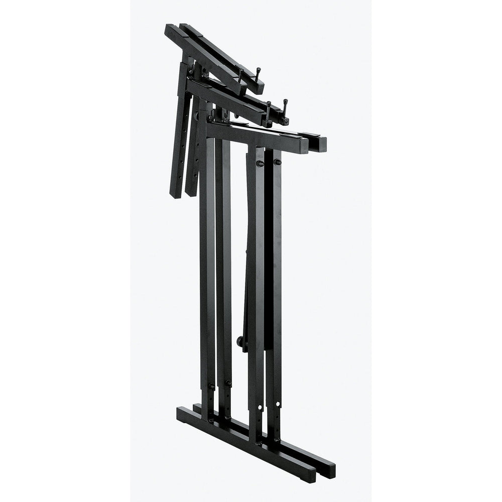 This professional, black powder-coated aluminum keyboard stand is designed to offer both style and functionality. With height-adjustability from 630 mm to 960 mm, it accommodates various keyboard heights. The stand's sturdy construction can hold up to 50 kg and provides ample support with a depth of 400 mm and width of 700 mm. Its versatile design allows for the addition of stackers to hold additional keyboards, making it a reliable choice for musicians needing flexibility and durability.