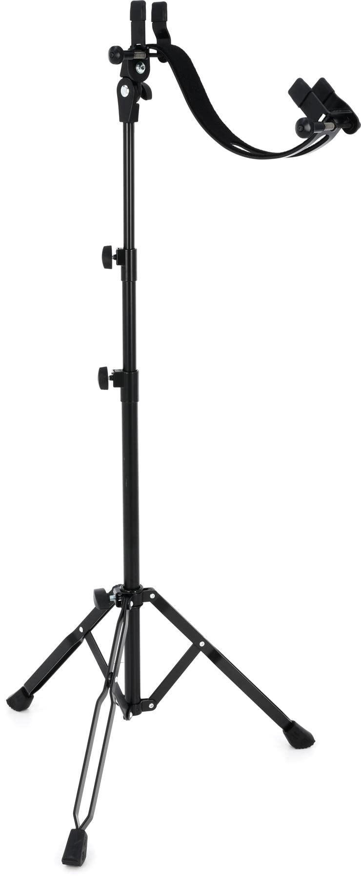For electric guitars, for convenient playing. 2-way height adjustment. Felt-lined instrument support arm. Angle and length adjust to your needs.