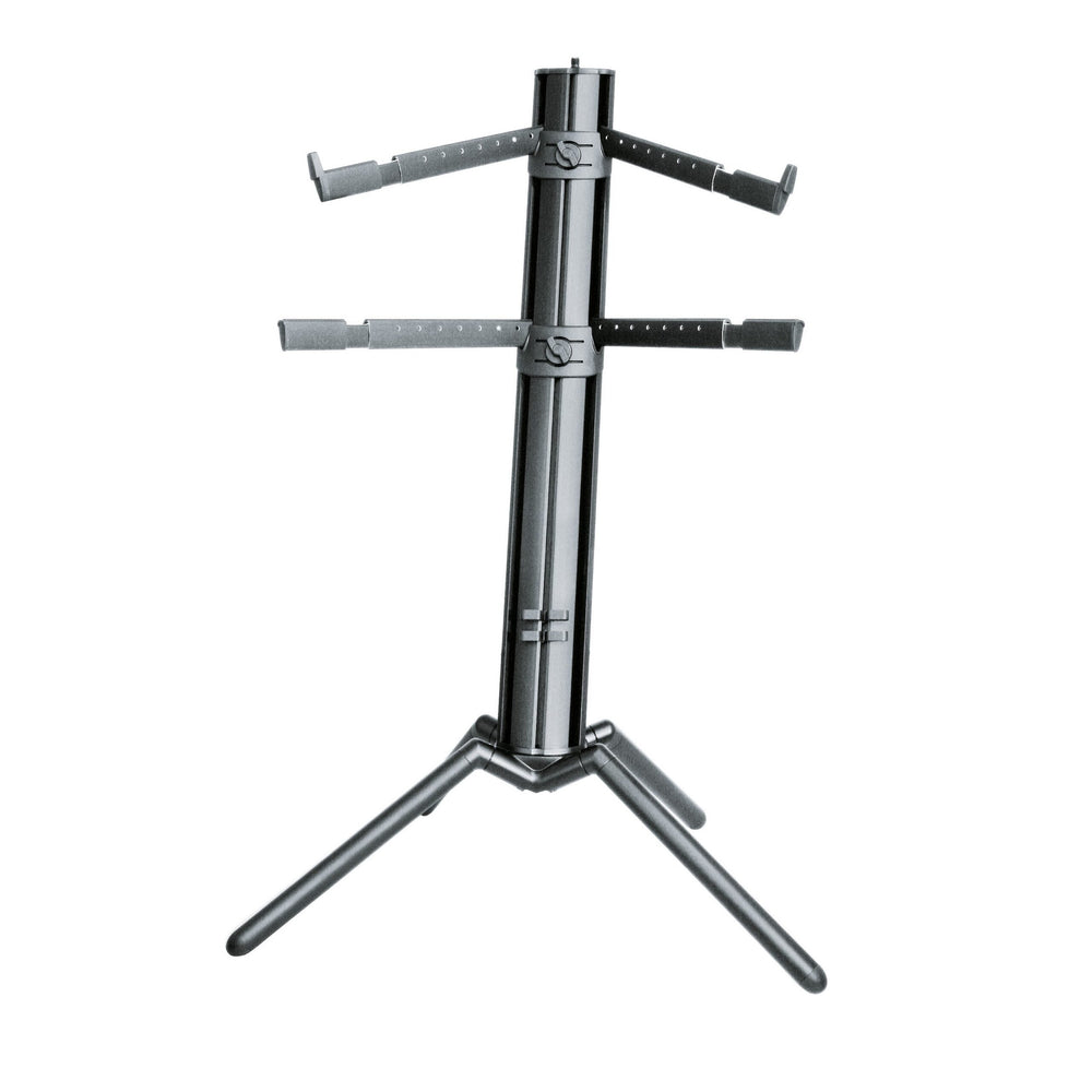 The Spider Pro is the further development of the Spider keyboard stand. The Spider Pro is equipped with a pair of extendable support arms, as well as an additional pair of extendable support arms with a 15 tilt angle. The Spider Pro can be fitted with additional support arms for a third keyboard. The Spider Pro also has a 3/8ā or 5/8ā threaded connection for attaching microphone booms. The tilt of the Spider Pro is greater than that of the Spider to allow easier playing when two keyboards are being used. On top of this, the Spider Pro also provides optimum leg movement thanks to the raised design of its feet, continuously variable height adjustment and a special mechanism for collapsing the stand as well as easy carrying of the stand in the bag, which is available as an optional extra.