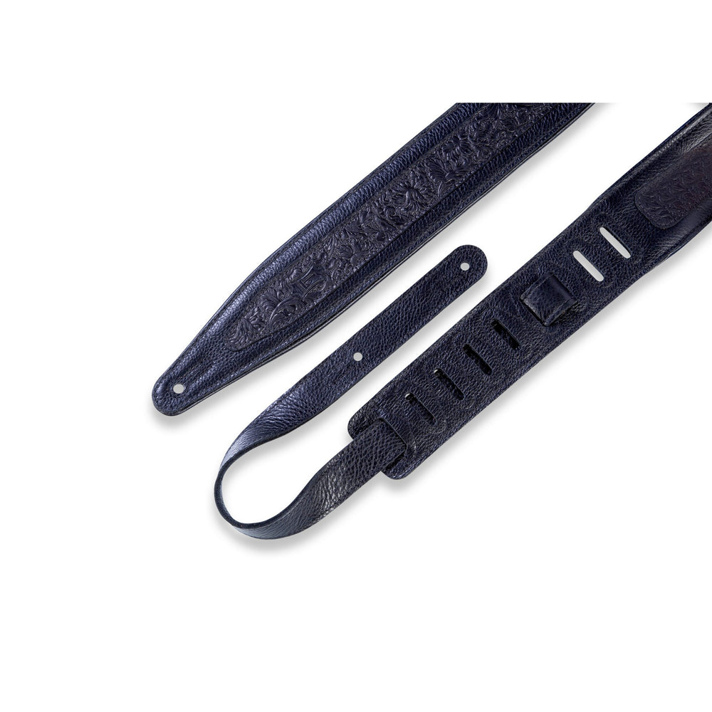 2 1/2" Garment Leather Guitar Strap with Foam Padding And Garment Leather Backing. Black Embossed Florentine Overlay. Adjustable from 46" to 60". Black Color Garment Leather Top And Bottom.