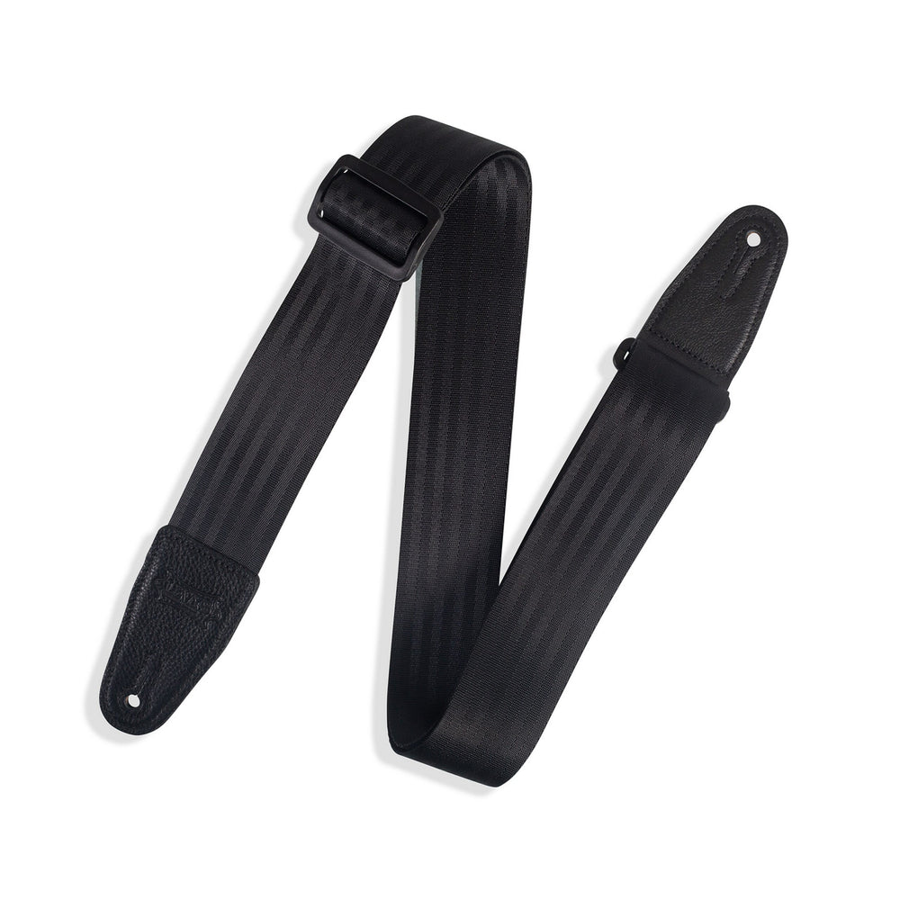 - Levy's 2" seatbelt guitar strap in black with reinforced black garment leather ends.