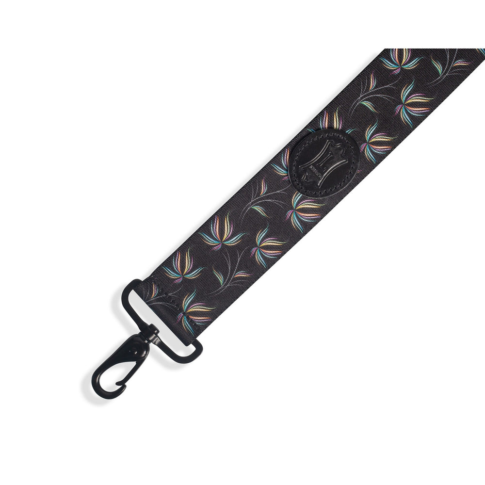 2 inch Wide Professional Case Strap With Printed Dandelion Pattern and Levy's Black Signature Veg-Tan Oval. Black Metal Swivel Clip Hardware with Black Plastic Slide Adjusts From 35 to 60 inches.