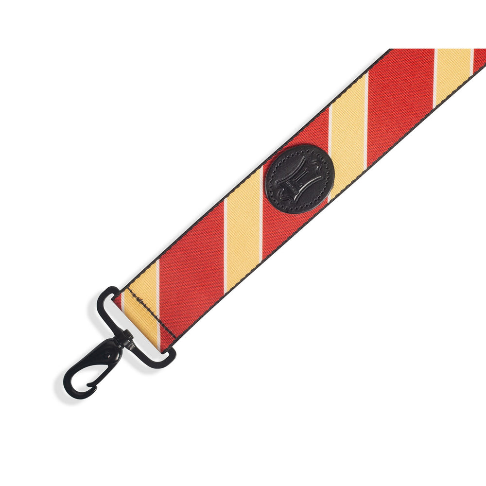 2 inch Wide Spirit Case Strap With Printed Maroon and Mustard Stripe Pattern and Levy's Black Signature Veg-Tan Oval. Black Metal Swivel Clip Hardware with Black Plastic Slide Adjusts From 35 to 60 inches.