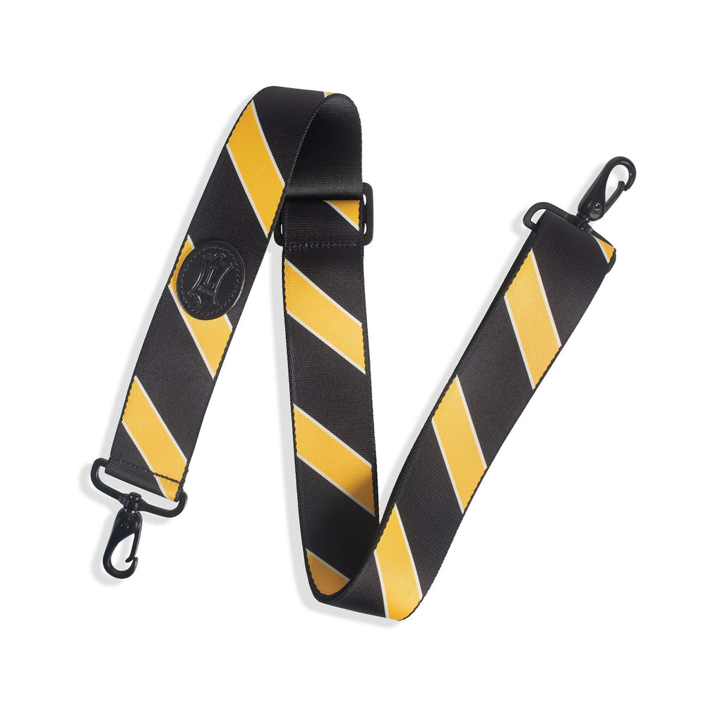 2 inch Wide Spirit Case Strap With Printed Black and Yellow Stripe Pattern and Levy's Black Signature Veg-Tan Oval. Black Metal Swivel Clip Hardware with Black Plastic Slide Adjusts From 35 to 60 inches.