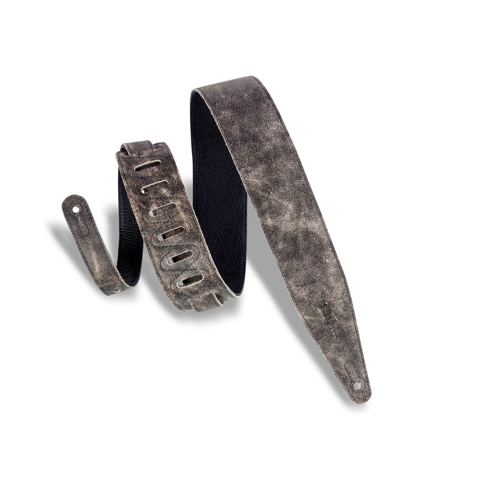 - Two-ply distressed garment leather guitar strap with black garment leather backing. Adjustable from 46" to 60".
