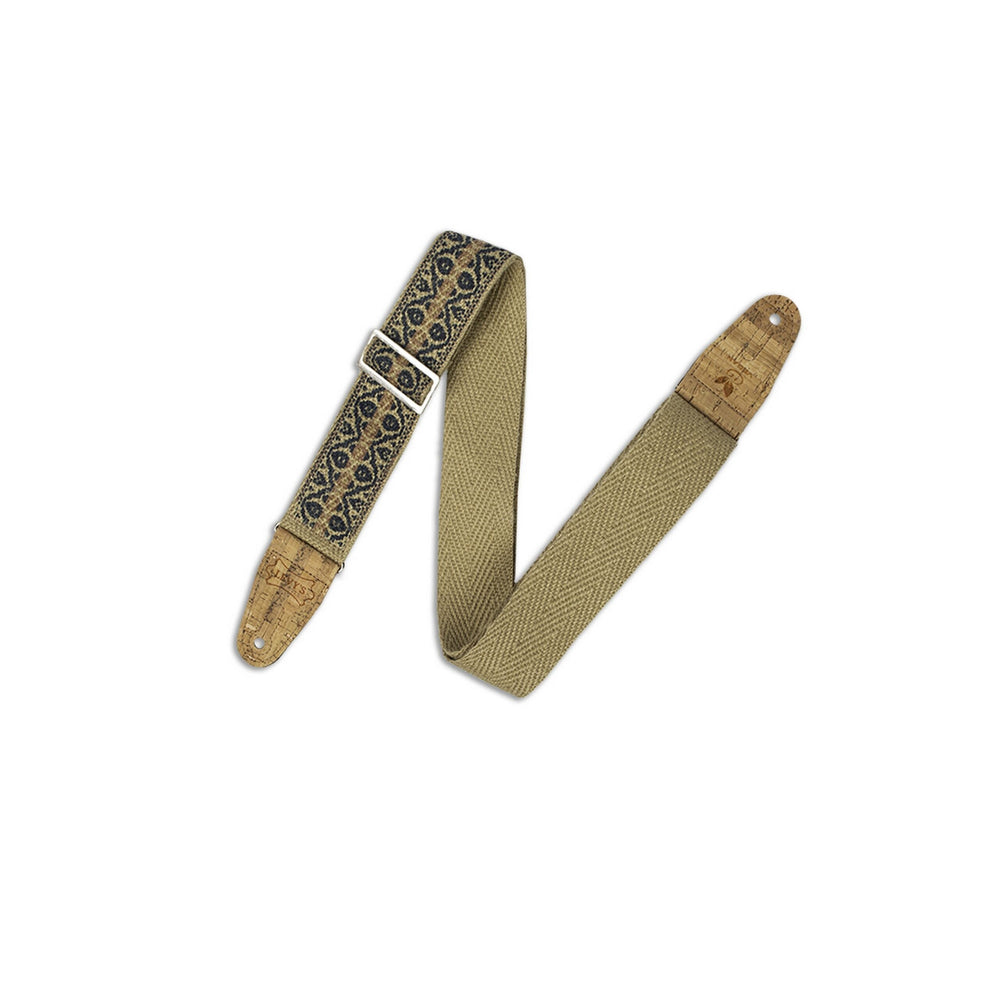 - Levys 2 Inch Hemp Vegan Guitar Strap With Berry And Taupe Motif On Natural Hemp Webbing With 2-Ply Cork Ends.