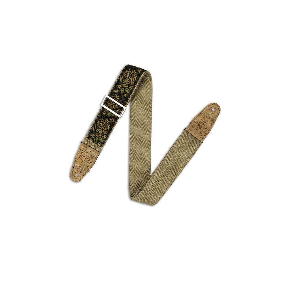 - Levys 2 Inch Hemp Vegan Guitar Strap With Printed Rosa Motif In Yellow ,Orange And Black On Natural Hemp Webbing With 2-Ply Cork Ends.