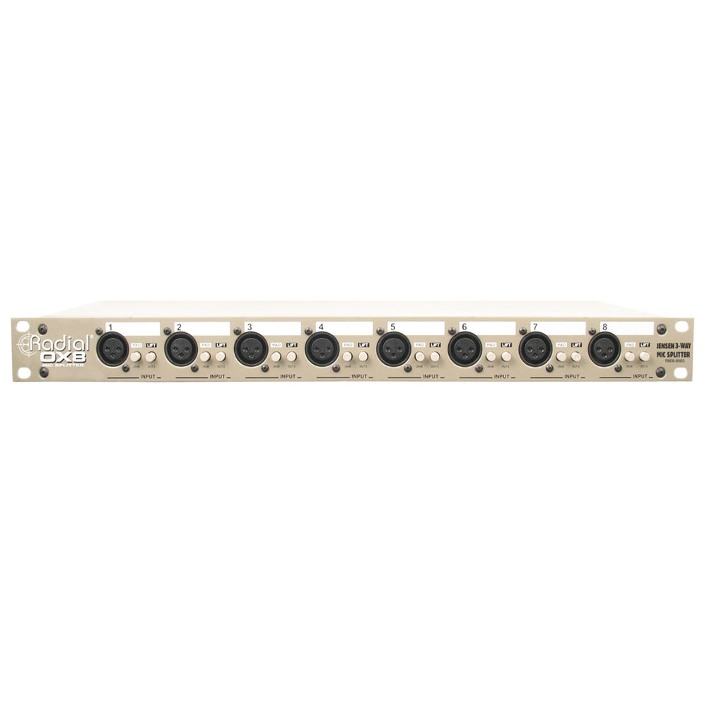 The Radial OX8-r 8-Channel Microphone Splitter is an industry-leading audio tool designed for both live stages and broadcast studios. This versatile device splits up to eight microphone signals to multiple destinations simultaneously while ensuring pristine audio quality without noise or distortion. The OX8-r eliminates hum and buzz from ground loops, making it an invaluable asset in any audio setup. Equipped with balanced inputs, direct outputs for 48V phantom power, and fully transformer-isolated outputs, the OX8-r guarantees top-notch performance in even the most demanding environments.
