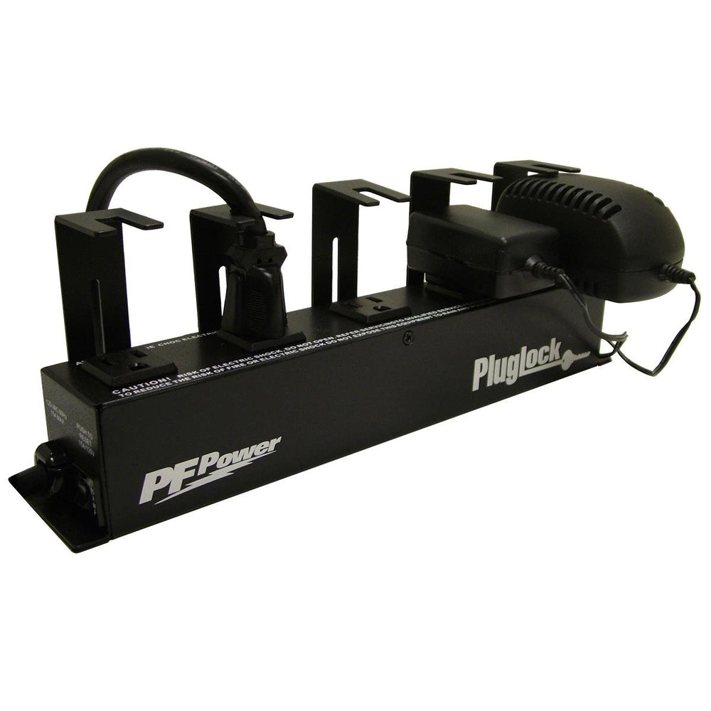 The PLUGLOCK-PFP circuit-breaker protected locking outlet strip provides enough wall wart spacing for five bulky transformers and can be safely mounted out of sight, in the rear of your rack.