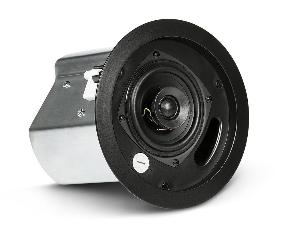 The JBL CONTROL 14C/T-BK is a superior ceiling loudspeaker designed to deliver high-quality sound for both commercial and residential spaces. Equipped with a 100 mm (4 inch) high-tech cone driver and a 19 mm soft-dome liquid-cooled tweeter, this full-range speaker ensures exceptional audio fidelity and coverage. The unit is housed in a vented, paintable baffle made of UV-resistant UL94-V0 and UL94-5HB material, featuring a pre-attached blind-mount backcan for easy and efficient installation. Available in an elegant black finish, it's an ideal solution for any environment requiring top-tier sound quality.