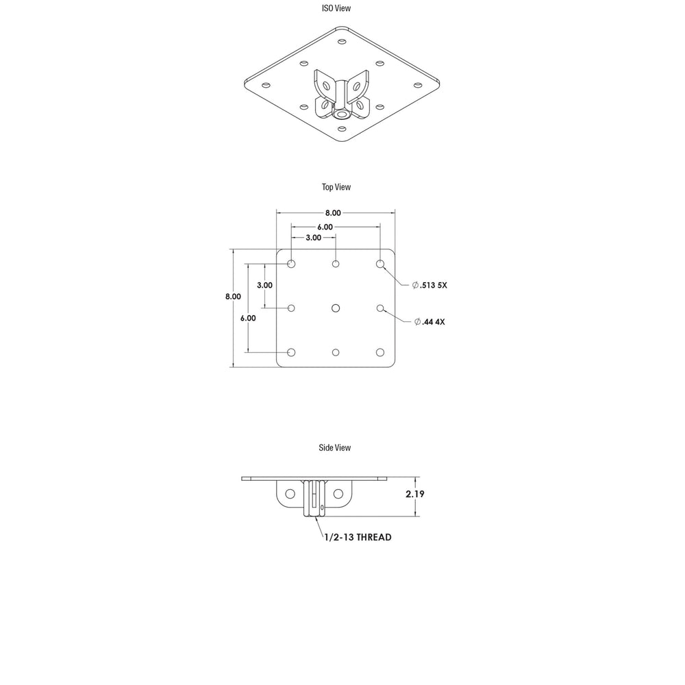 The MP-500-13-CM attaches audio and video mounts to flat ceiling or structures. This ceiling mount assembly accepts 1/2-13 threaded rods in length up to 48”.