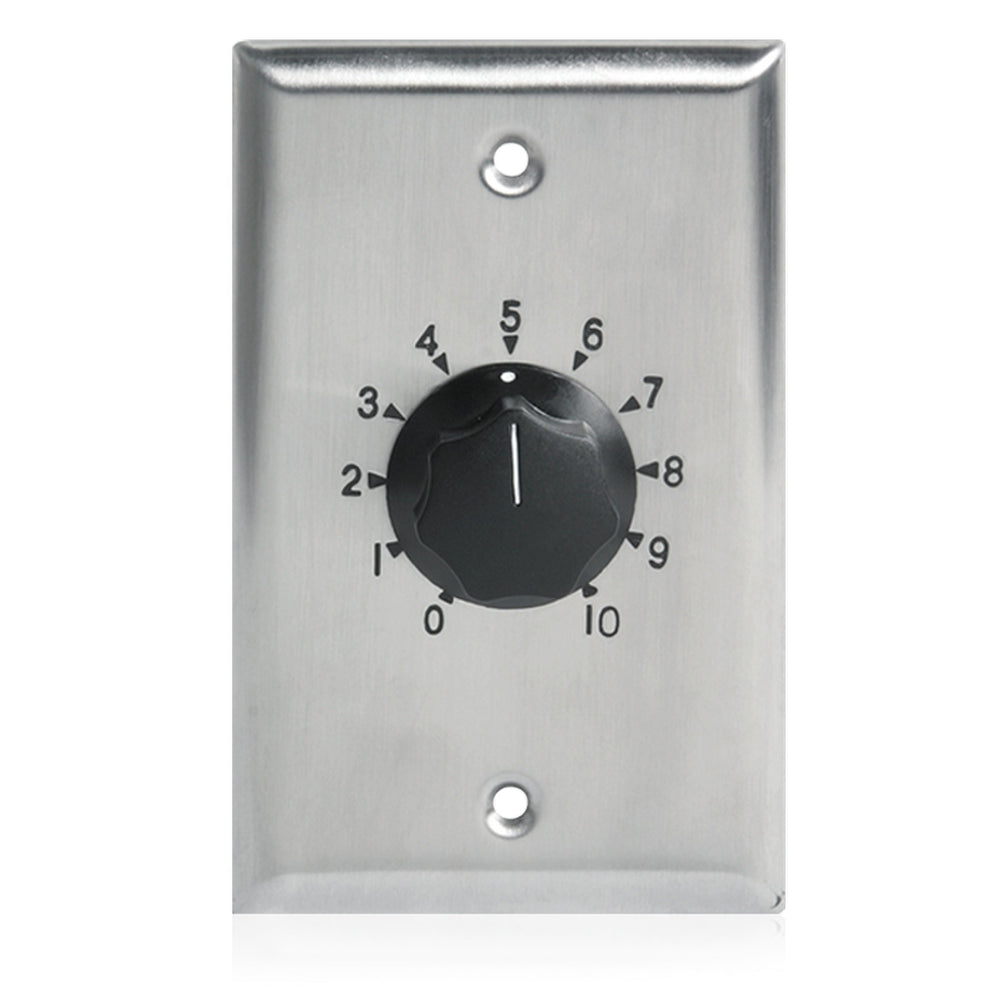 Constructed with a stainless steel plate and featuring a clearly marked dial scale, the AT10 combines professional-grade aesthetics and function. The unit is easily installed into most standard 1-gang electrical boxes and includes a removable terminal block for simplified wiring. The skirted black knob provides easy volume adjustment, making this attenuator an excellent choice for commercial AV installations demanding clarity and control.