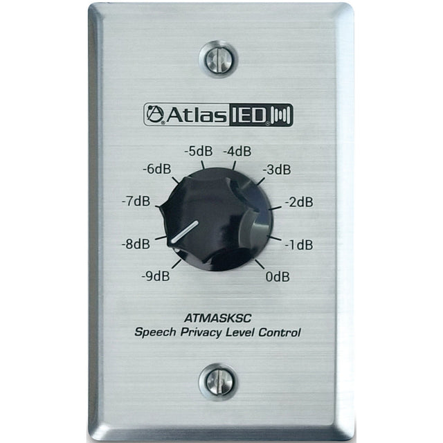 The AtlasIED ATMASKSC is a wall‑mounted precision attenuator designed specifically for use with the M1000A35 Self‑Contained Active Masking System. Featuring a ten‑position, non‑shorting rotary switch without end‑stop, it offers 1 dB attenuation steps from 0 dB to –9 dB for refined sound masking adjustments. Built to meet the rigorous needs of commissioning professionals, this plate seamlessly integrates into masking systems to ensure accurate and consistent audio level control.