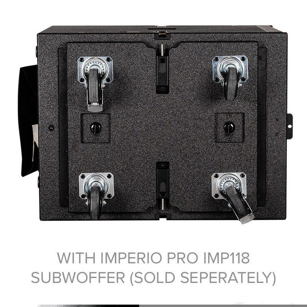 - The IMC118 caster board is securely attached to the Imperio Pro IMP118 subwoofer (sold separately) using a built-in locking pin, ensuring maximum protection for the grill and driver while being transported.