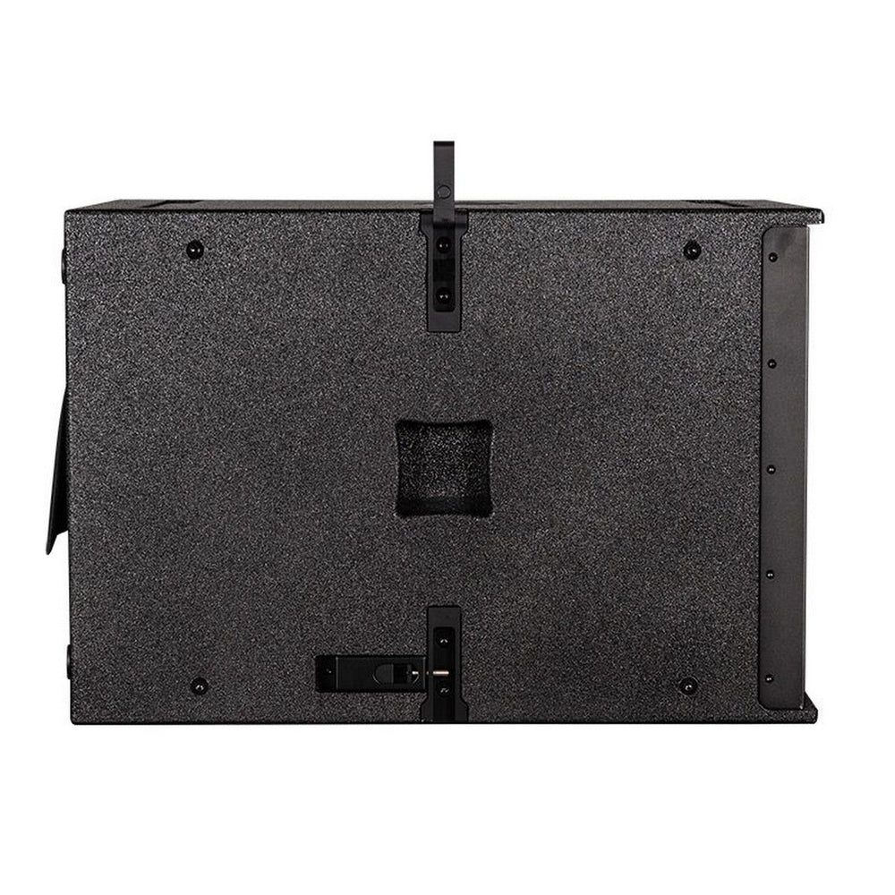 Facilitating installation flexibility, it features 20 captive-nut fly points (M10) and a pole mount (M20). Its design includes recessed handles, bottom nylon skids, and rear rubber feet for easy transportation and stacking.