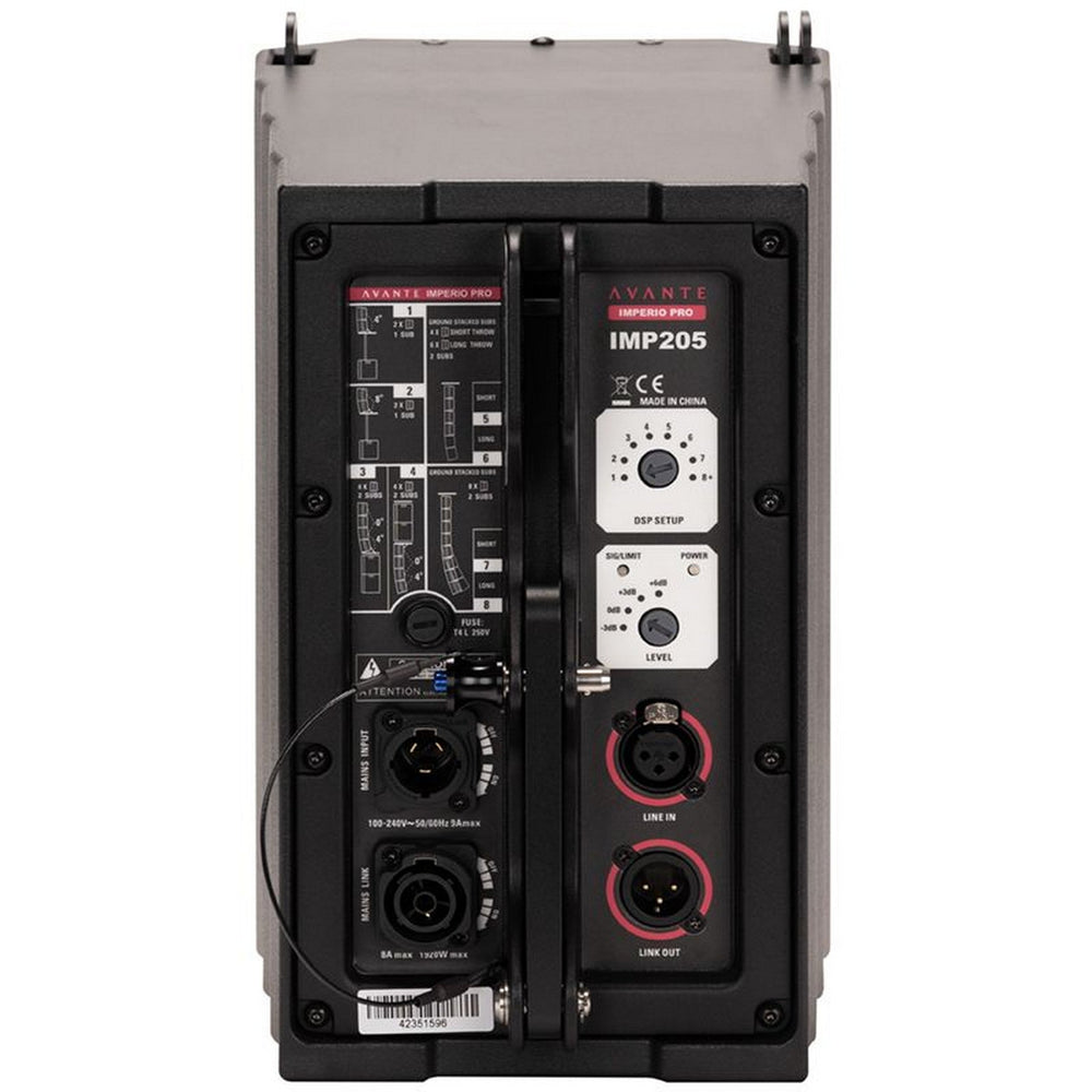 The Avante IMPERIO PRO Avante 2-Way Active Cabinet enhances the accomplishments of Avante Audio's original Imperio Series. Engineered for rapid deployment and adaptability, the Imperio Pro IMP205 is a compact and lightweight active line array system featuring cutting-edge neodymium components: Dual 5-inch Low-Mid transducers and Six 1.75" IDVAT HF drivers (Inverted Dome Vertical Array Technology). Each module of the IMP205 array is powered by a 440W RMS (1700W Peak) Class-D Power Amplifier with PFC Switching power supply.