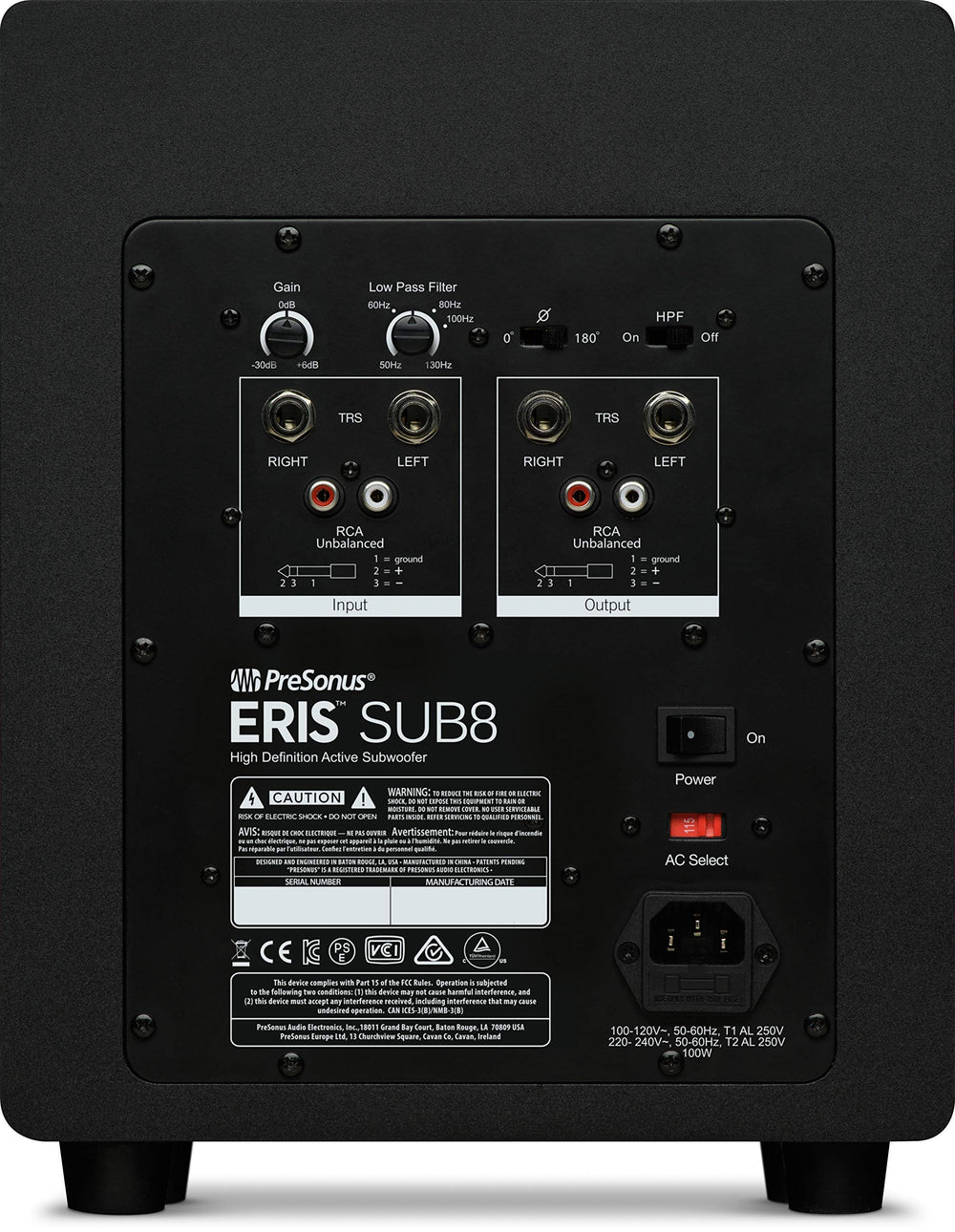 - Defeatable highpass filter removes frequency content below 80 Hz from the full-range signal sent from the Eris Sub8 outputs to the main speakers