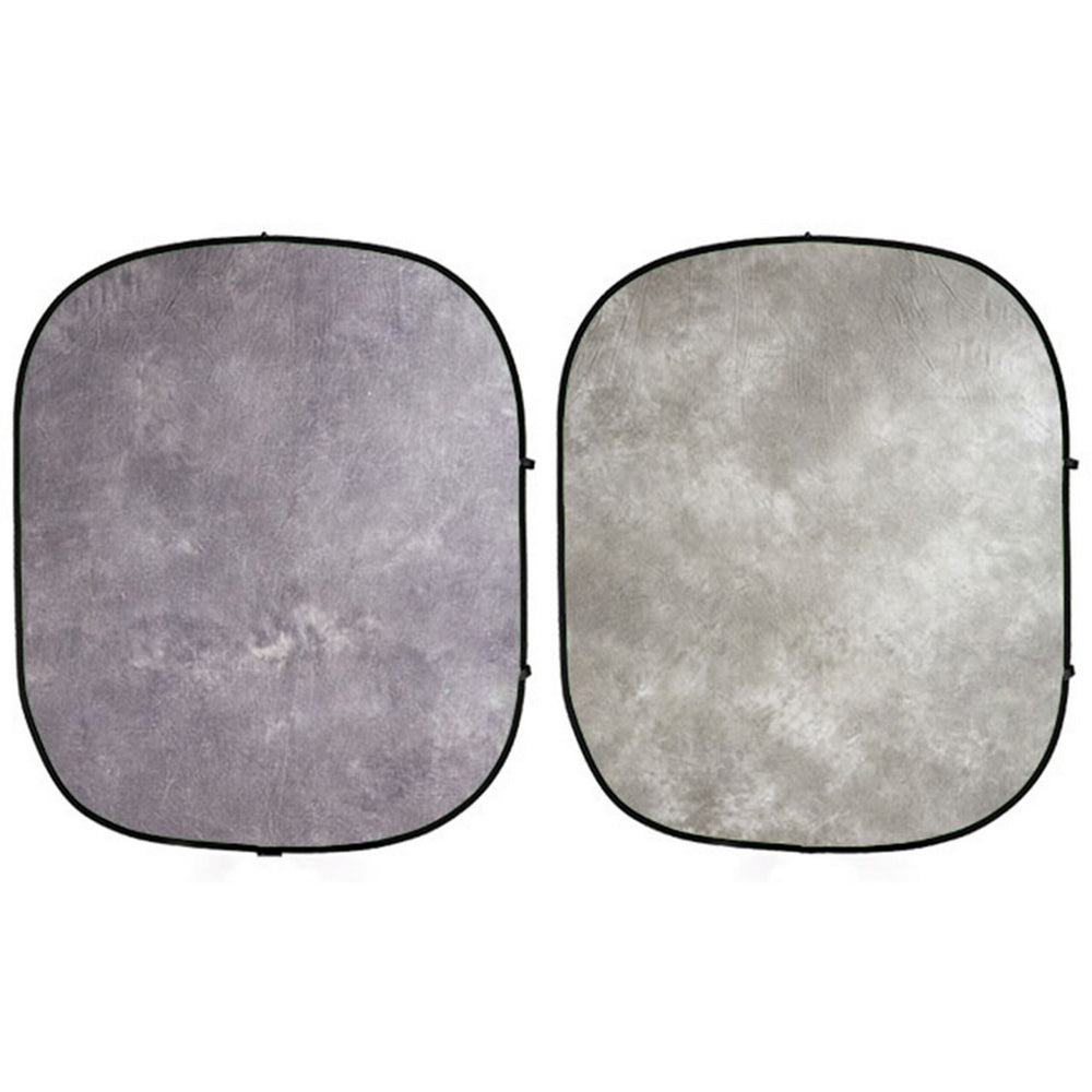 Savage Monsoon Reversible Collapsible Background has a mottled design primarily in soft gray and purple that reverses to a lighter version in which shades of gray and green are more dominant. Made of high-quality, non-reflective cotton that eliminates glare.