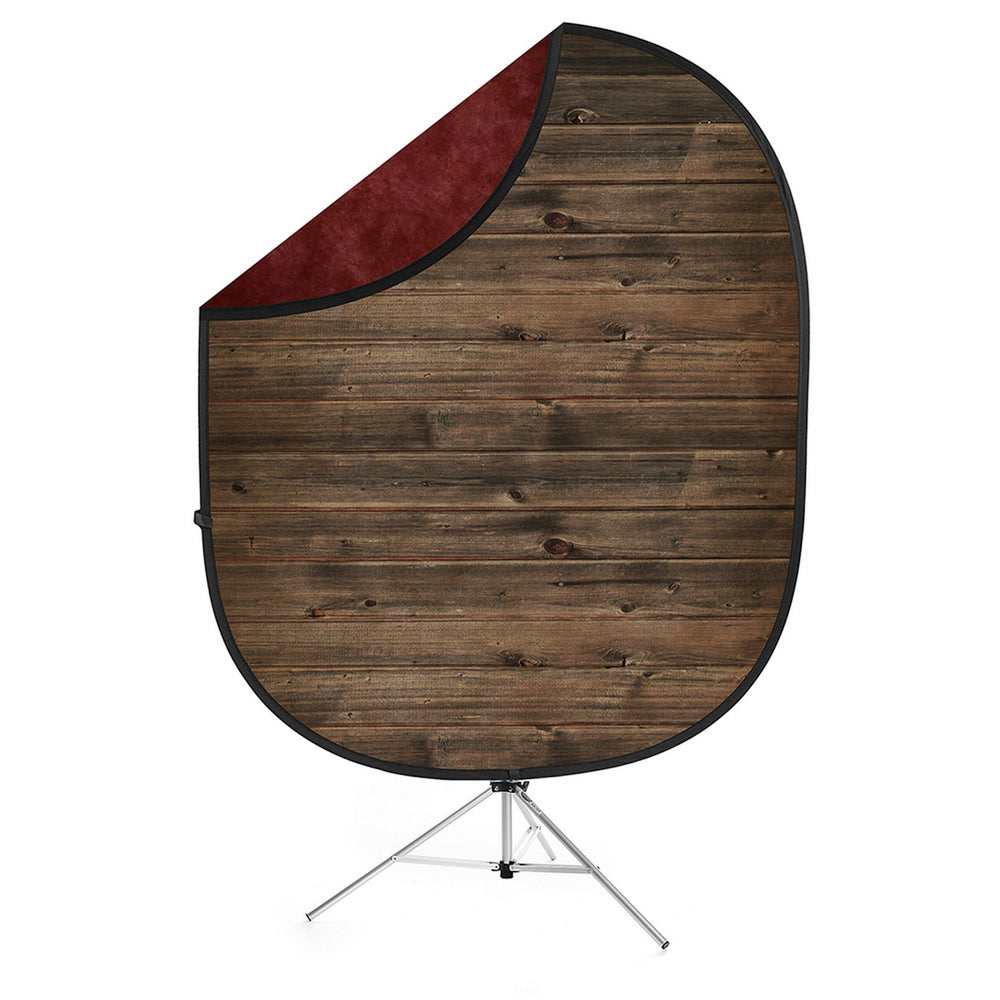 The Savage Rustic Planks/Red Collapsible Backdrop displays a brown worn wood print on the front, and reverses to a beautifully dyed, vibrant red finish on the backside. This unique combination of eye-catching background styles allows a photographer to easily and quickly go from grunge to classic in one photo shoot. Made of high-quality, non-reflective cotton that eliminates glare.