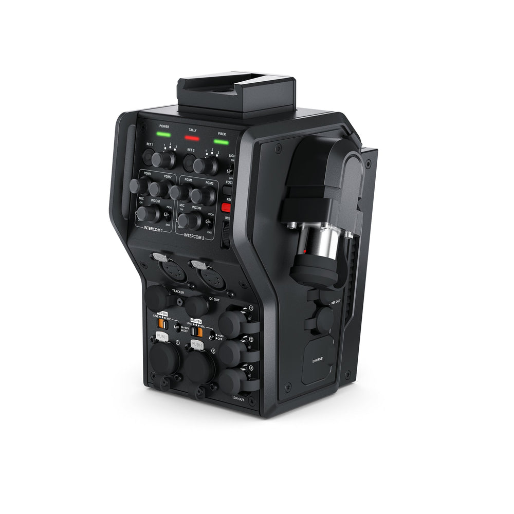 The Blackmagic Camera Fiber Converter lets you extend and power your URSA Broadcast from up to 2 km away using industry standard SMPTE fiber cables. It also includes common live camera controls with multiple channels of talkback and standard television industry talkback headset connections. The Blackmagic Camera Fiber Converter features 1 Ultra HD camera feed, plus 3 HD return feeds in a compact IP video based design.
