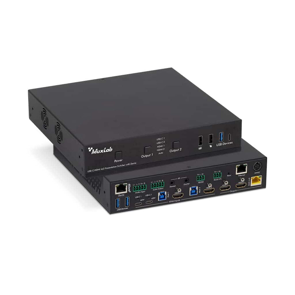 The MuxLab USB-C HDMI 4x2 Presentation Switcher with Dante is a professional presentation switching solution designed for advanced multimedia environments. It enables seamless switching between USB-C and HDMI sources with integrated video, audio, and networked Dante audio support. This system is built to meet the demands of modern conference rooms and control applications.