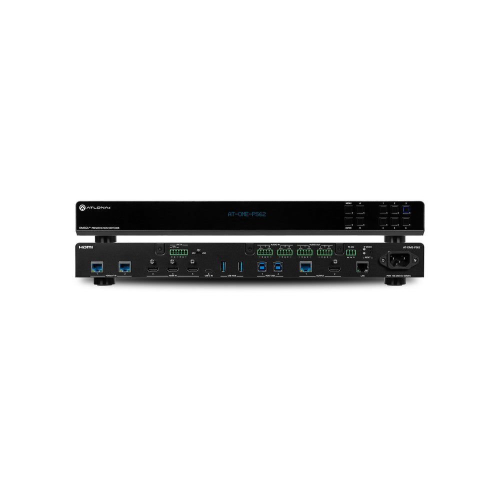 The Atlona AT-OME-PS62 is a 6x2 matrix presentation switcher designed for modern AV systems, offering flexible HDMI, HDBaseT, and USB-C connectivity. This versatile device combines powerful video switching, USB extension, and audio processing in a compact 1U rack-mountable design—ideal for conference rooms, classrooms, and collaborative spaces requiring multi-format presentation control.
