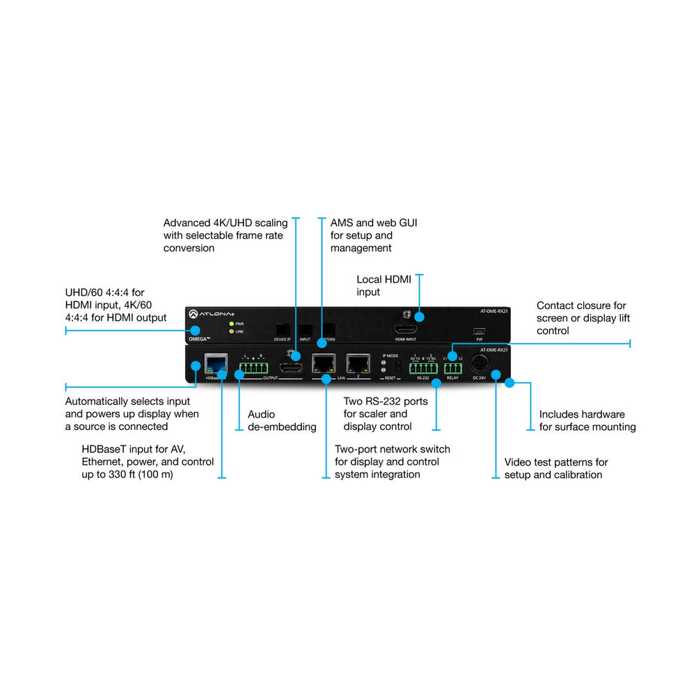 - HDBaseT Receiver and Scaler: Receives 4K/UHD video, audio, Ethernet, and control up to 330 ft (100 m) over category cable.
