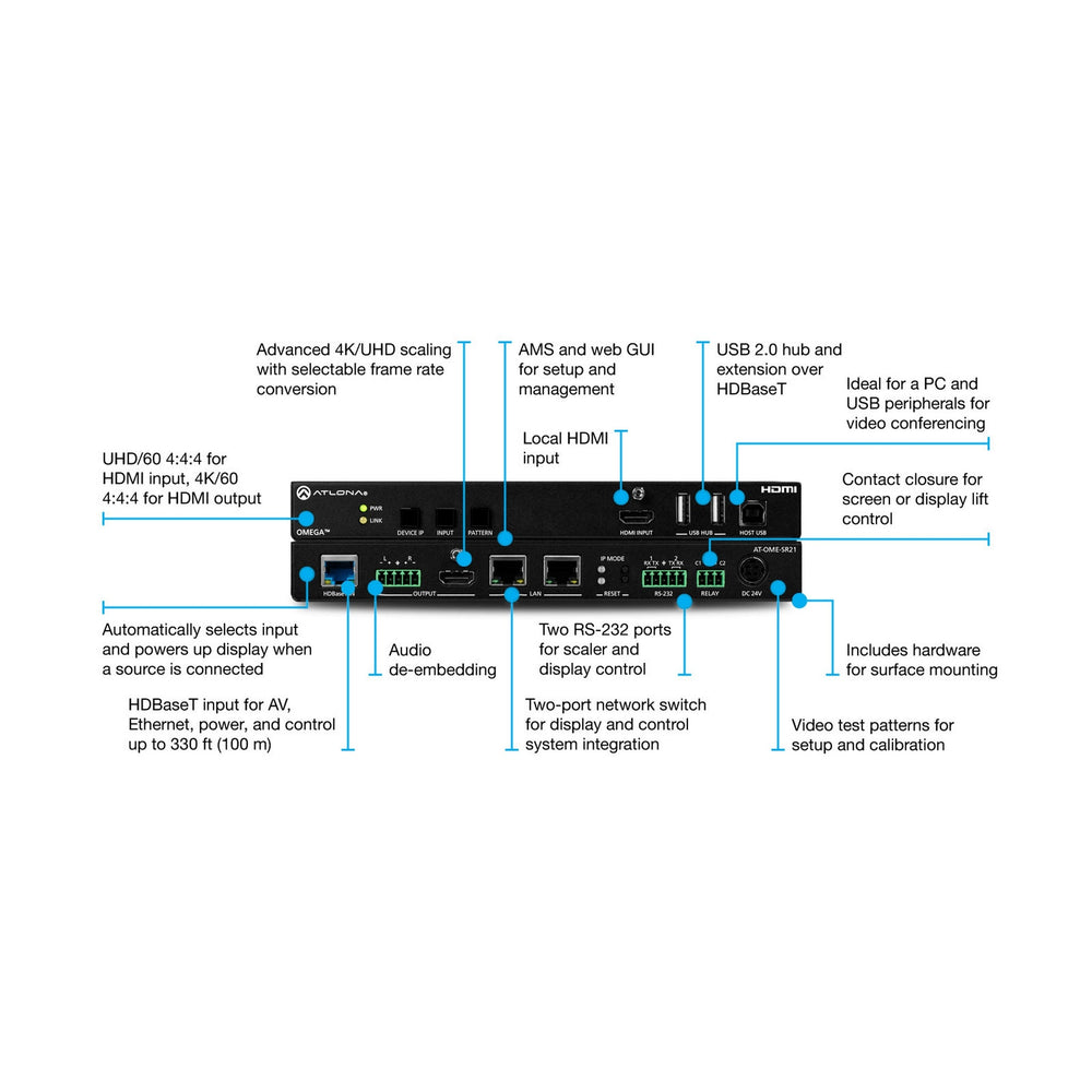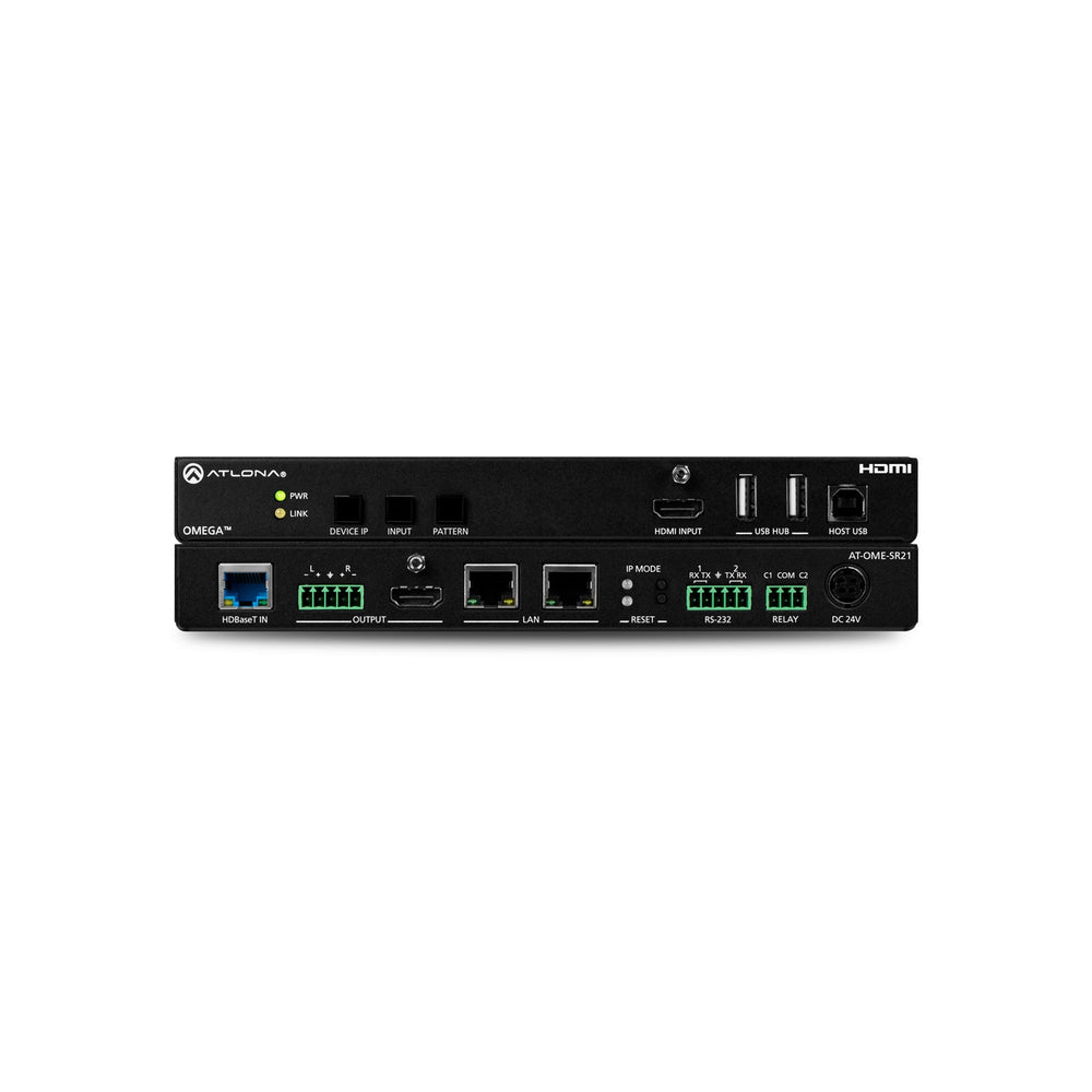 The Atlona AT-OME-SR21 is a 2×1 AV switcher, HDBaseT receiver, and 4K/UHD scaler with integrated USB 2.0 extension and hub functionality. As part of the Omega™ Series, it provides a versatile and professional AV solution designed for conferencing, presentation, and hybrid meeting environments. Supporting both HDMI and HDBaseT inputs, the OME-SR21 delivers exceptional flexibility for installations requiring long-distance signal transmission, USB peripheral extension, and display control.