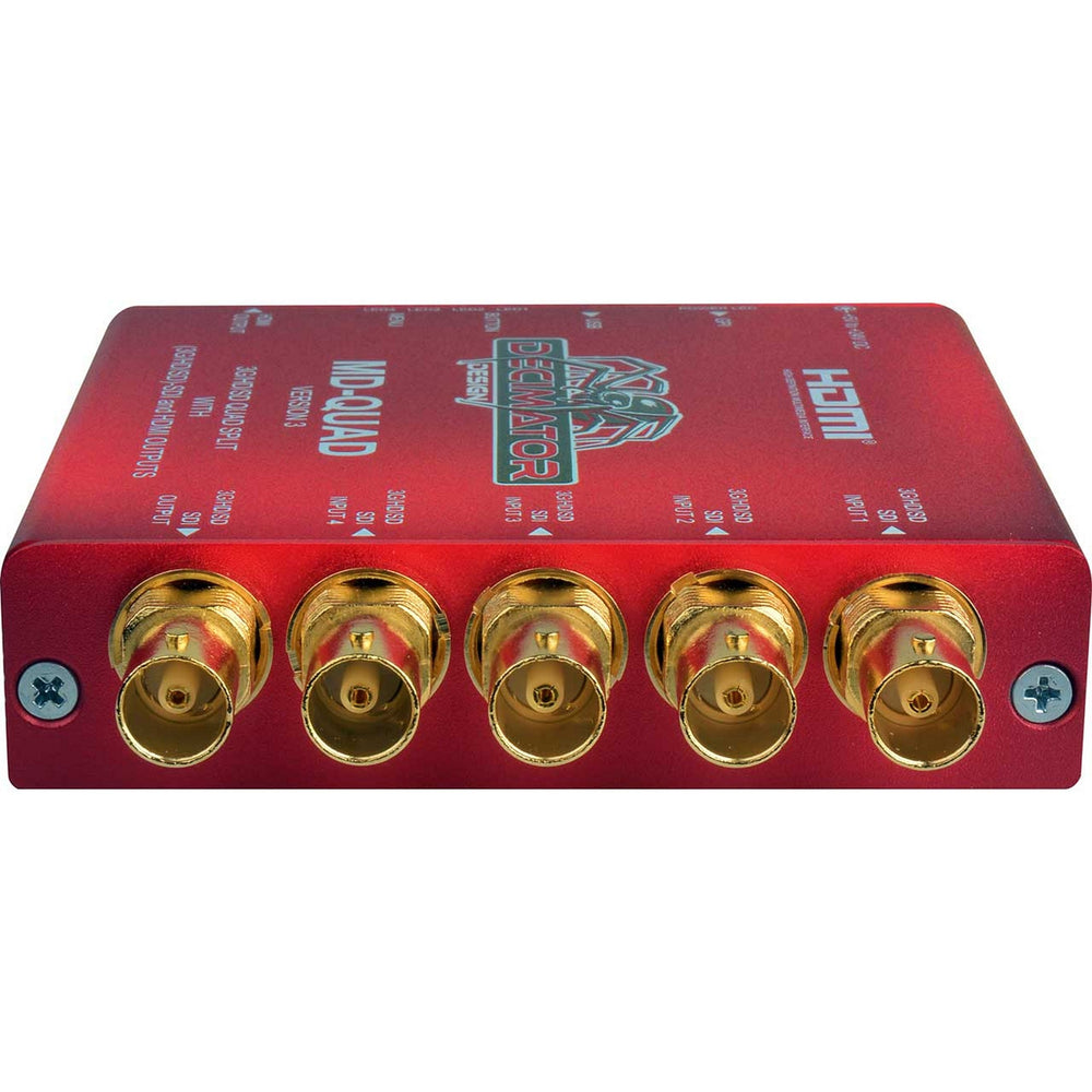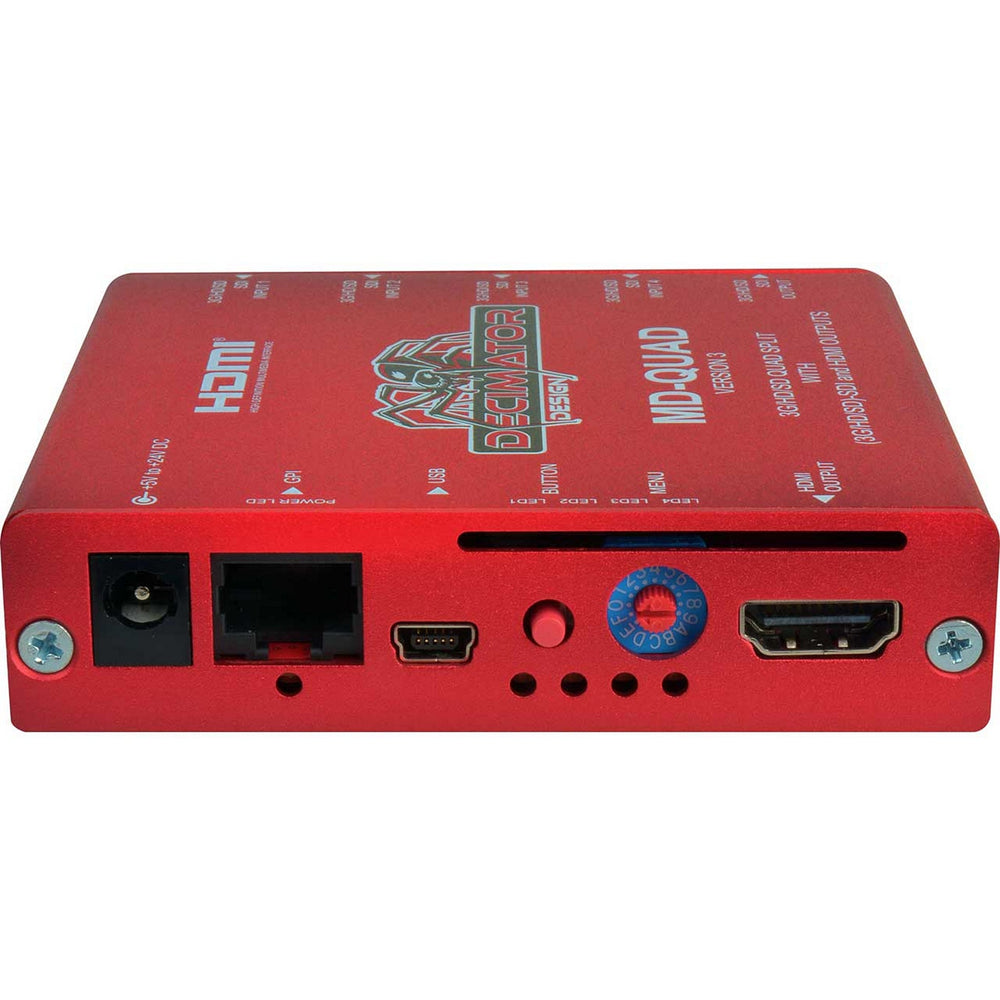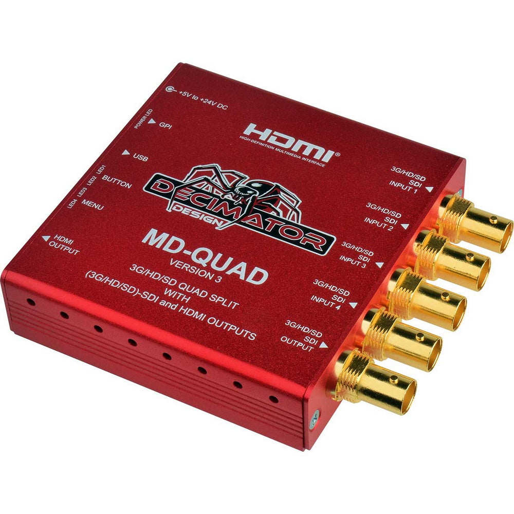The Decimator Designs MD-QUAD is a miniature (3G/HD/SD)-SDI MULTIVIEWER / QUAD-SPLIT with (3G/HD/SDI)-SDI and HDMI Outputs.