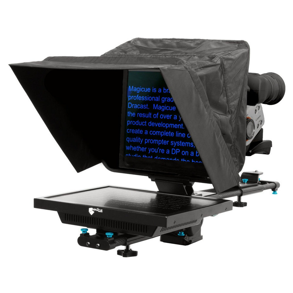 The Magicue Studio 15" Prompter Kit is a complete, modular teleprompting solution supporting a wide range of camera sizes. The system includes a 15" LCD monitor offering HDMI, VGA, and Composite inputs and an HDMI output. It works with any standard size tripod supporting the required payload capacity. Assembly/disassembly is tool-less and the system folds flat for convenient transport and storage.