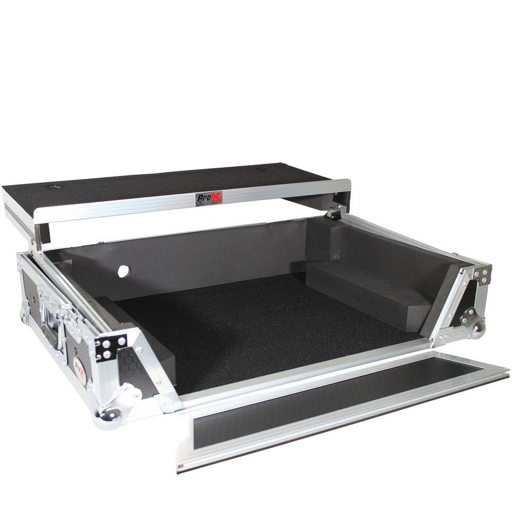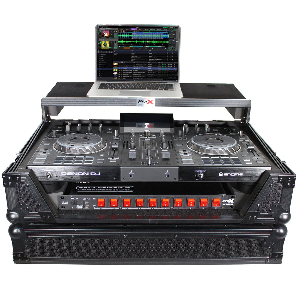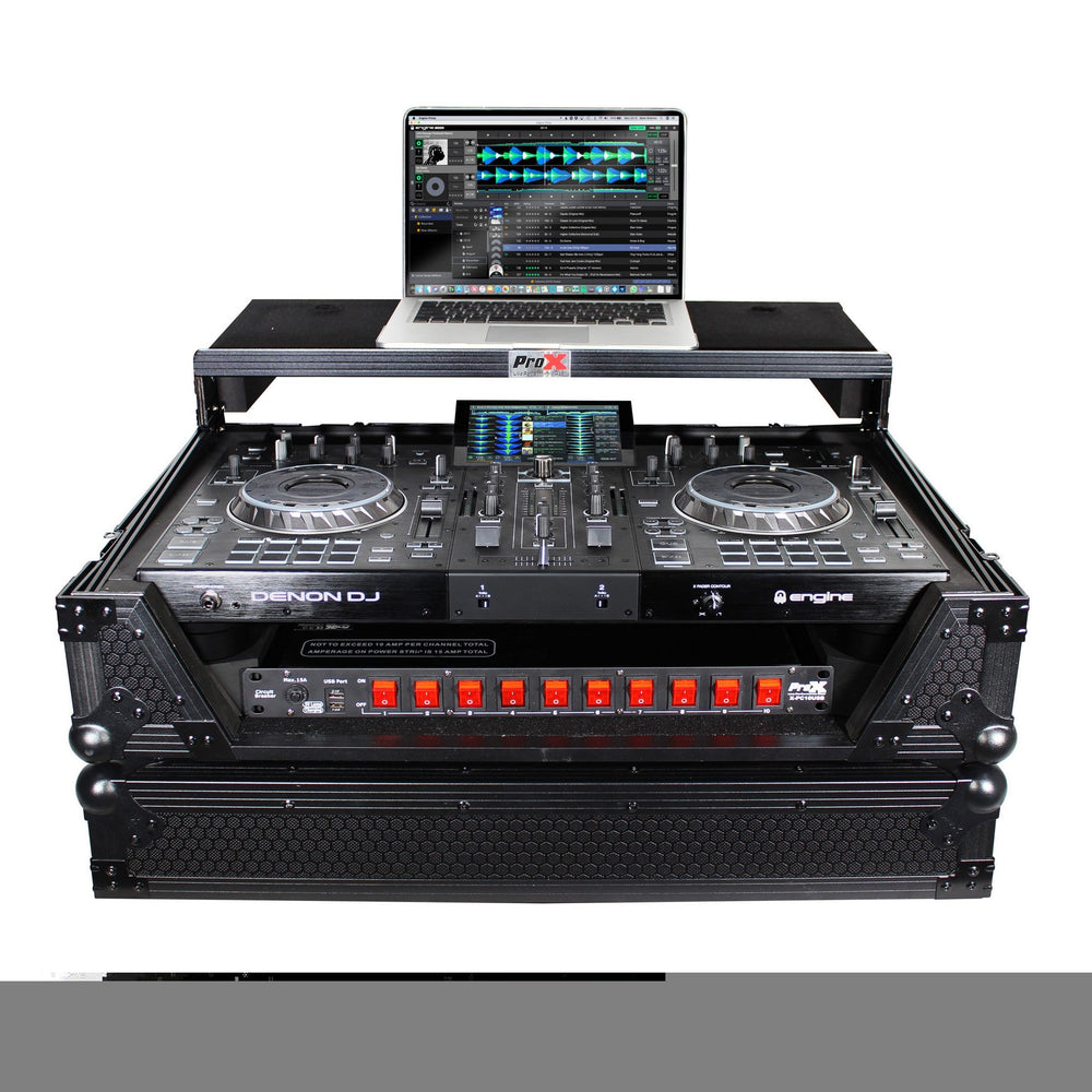 The ProX XS-PRIME2 Case for Denon PRIME 2 DJ Controller with Laptop Shelf offers reliable protection for your standalone DJ system, featuring a convenient Removable Sliding Laptop Shelf atop and a 1U Rackspace below the device. Crafted from sturdy 3/8" Series Plywood with reinforced steel ball corners, this case is designed for durability. It boasts recessed steel padded handles and latches for secure handling. The back and bottom compartments provide ample space for cables and small accessories, while a removable front panel allows easy access to front input jacks and the 1U Rackspace beneath (XS-RSS1U Brackets Not Included).