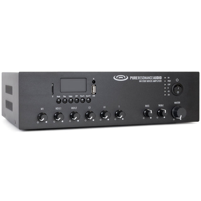 The Pure Resonance Audio MA120BT is a versatile 7 channel commercial mixer amplifier equipped with built-in Bluetooth and a 70V/100V transformer solution for small to medium scale audio installations. With its compact form and flexible outputs, it brings reliable performance to background music, paging, and multi-use venues.