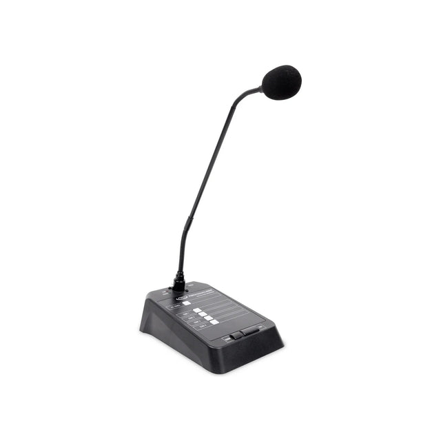 - Push-to-talk desktop microphone designed for multi-zone paging