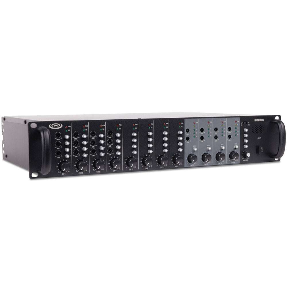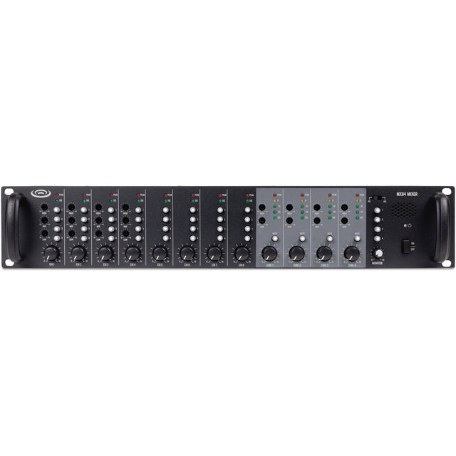 Built for reliability and integration, the MX84 accepts XLR, TRS, and RCA inputs, includes phantom power on the first two channels, and offers a priority-mute input for emergency system integration. Its compact 2U chassis fits standard racks while delivering flexible and professional audio management in multi-zone systems.