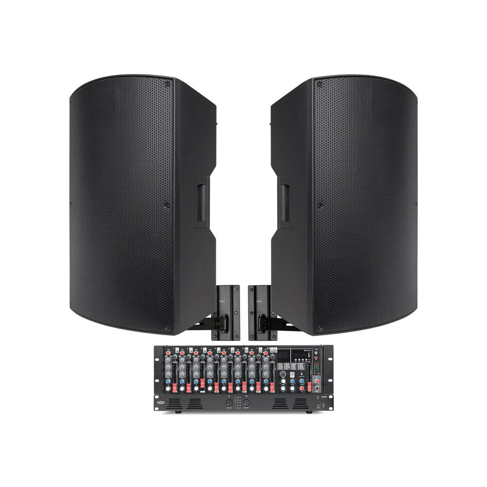 The included P115 15" passive loudspeakers handle 350W continuous power, ensuring wide-range audio coverage with high sensitivity and durable construction. The MX9 mixer offers built-in DSP effects and flexible connectivity, while the DA2500 amplifier supports both 70V and low-impedance configurations for installation versatility.