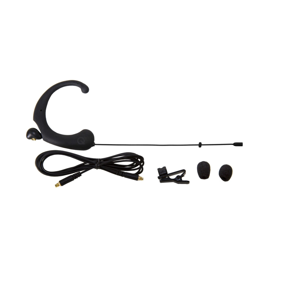 The Q DA12 incorporates the following features: the same 2.5mm diameter European designed capsule which has been proven to provide clear full-frequency audio. Enclosure design that protects the capsule in such as way as to be water resistant. Radical new earpiece design that can be adjusted to suIt'smaller and larger ears. Adjustable boom length to suit different faces and applications. DA-12 headworn microphone comes in a zipper pouch containing the mic, cable, tie clip, and two windscreens. At time of purchase, customer selects one adapter from the wide range available (priced separately).
