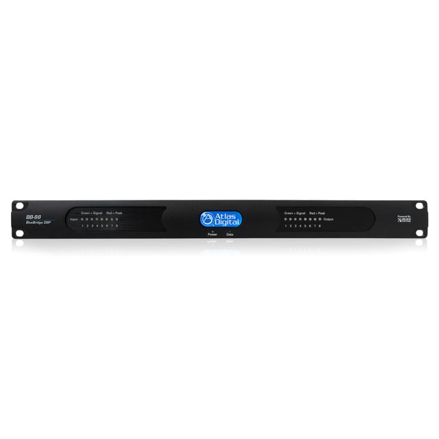The AtlasIED BB-88 and BB-88DT breakout boxes provide essential analog I/O expansion for BlueBridge DSP audio systems. These compact 1RU units offer 8 balanced analog inputs and 8 balanced analog outputs via DB-25 connectors, delivering professional-grade audio interfacing in a streamlined rackmount form factor. Designed for quick installation and reliable operation, both models include an external locking power supply and a rear-panel USB port for configuration and service access.