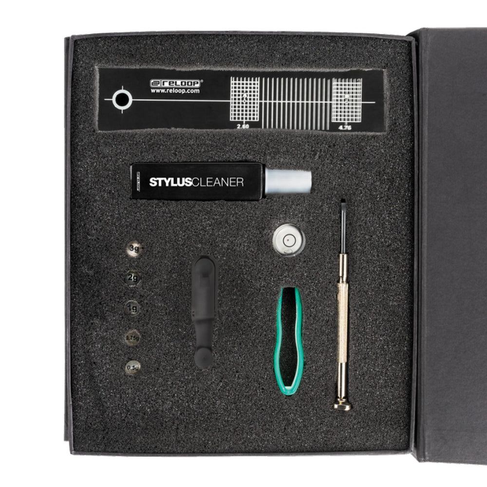 mirrored SME alignment tool, highly efficient stylus cleaning fluid, spirit level, stylus tracking force gauge, 5 balancing weights, metal screwdriver, tweezers, high-quality storage box