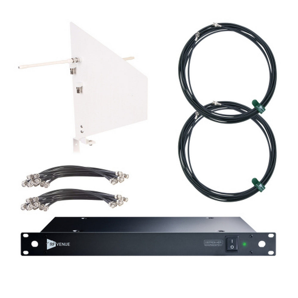 This RF Venue bundle includes one DISTRO9 HDR 9-channel antenna distribution system, one DFINW Diversity Fin wall-mount antenna (white) for wireless microphones, two RG8X25 25-foot coaxial cables with BNC (male) connectors, and two RG8X1.5-10 10-packs of 1.5-foot interconnect cables.
