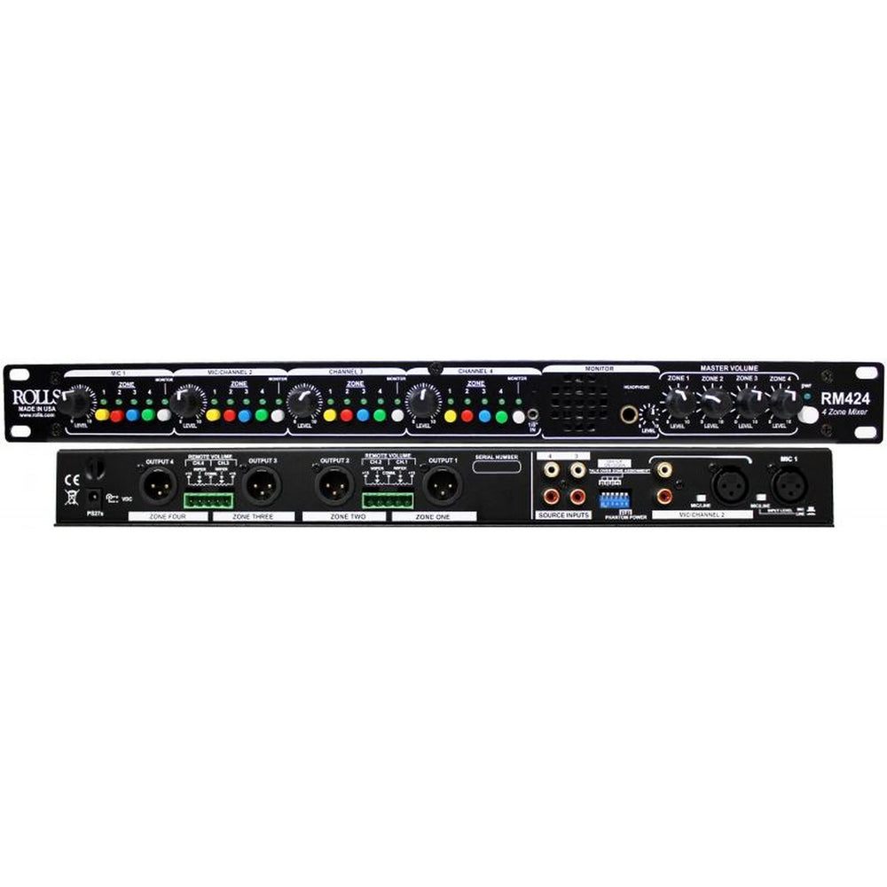 The new ROLLS RM424 Four Zone Mixer combines two paging microphones with two line level source inputs. Each input is switch selected to output to any combination of the four zone outputs. The outputs are all balanced XLR connectors. Remote Volume provides each zone with the means for external volume control. The Microphone inputs feature selectable ducking for paging. Front panel speaker makes pre assignment monitoring for each channel possible with individual switching for each channel. The RM424 is easy for anyone to use from the front, but from the rear it is just complex enough it will fill even the most demanding four zone installation requirements. With the included external power supply the RM424 has just about every approval known to man so you can spec it in almost any installation. The RM424 is the ideal solution for restaurants, offices, night clubs, etc.